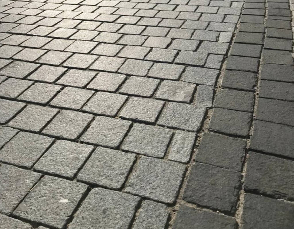 Gesägte Granit-Pflastersteine in Grau, geflammte Oberseite. Die Pflastersteine bewähren sich im Garten, auf Laufpfaden, Rändern und Zäunen. Dadurch erhalten die kleinen landschaftsgestalterischen Elemente eine gewisse Strenge. Es ist auch eine perfekte Wahl für den Ausbau von Verkehrsflächen – wie Straßen, Einfahrten und Parkplätze. Die Härte und Haltbarkeit von Granit-Pflastersteinen wird den Benutzern Langlebigkeit garantieren.