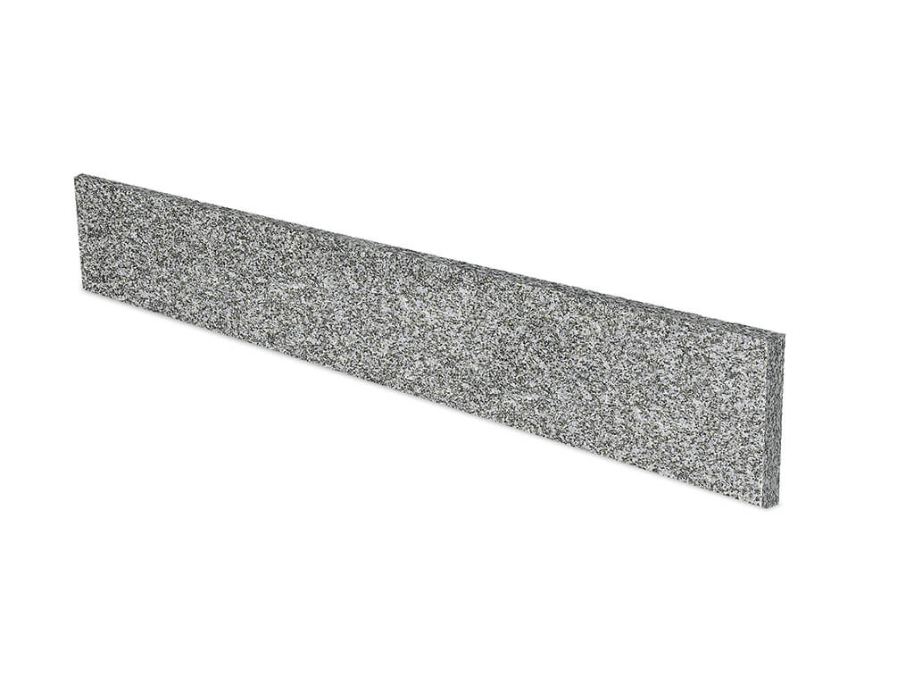 Granit-Verkleidungssetzstufe STRZELIN in grau. Es ist ein hochwertiges Produkt für die vertikale Verarbeitung von Treppenstufen. Dank der natürlichen Eigenschaften von Granit können wir uns seiner Haltbarkeit und Widerstandsfähigkeit gegenüber Sonne, Frost, Regen, als auch mechanische Beschädigungen sicher sein. Das Setzstufe ist leicht sauber zu halten, Schmutz können Sie sicher mit einem Hochdruckreiniger entfernen. Der Abschluss der Treppe mit einer Granit-Setzstufe verleiht der Treppe Eleganz und Stil. Die Oberseite der Stufe ist mit einem geflammten Finish versehen, der für eine poröse, raue und rutschfeste Oberfläche sorgt. Der Finish der Beflammung kann auch an den Vorder- und Seitenflächen durchgeführt werden – zusätzliche Option.